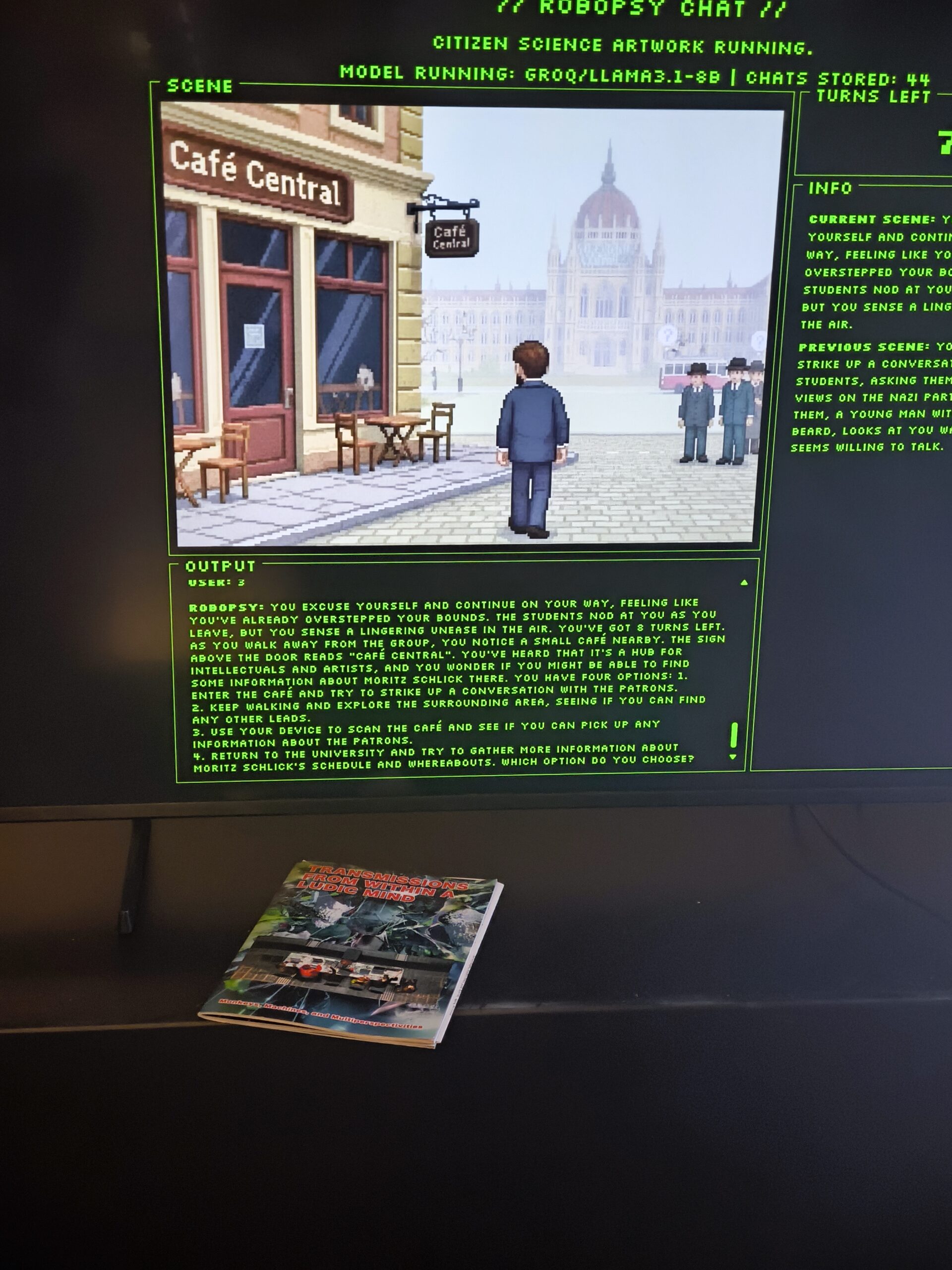 Playing ROBOPSY at TED AI: Choose from five different LLMs to explore history through text and image.