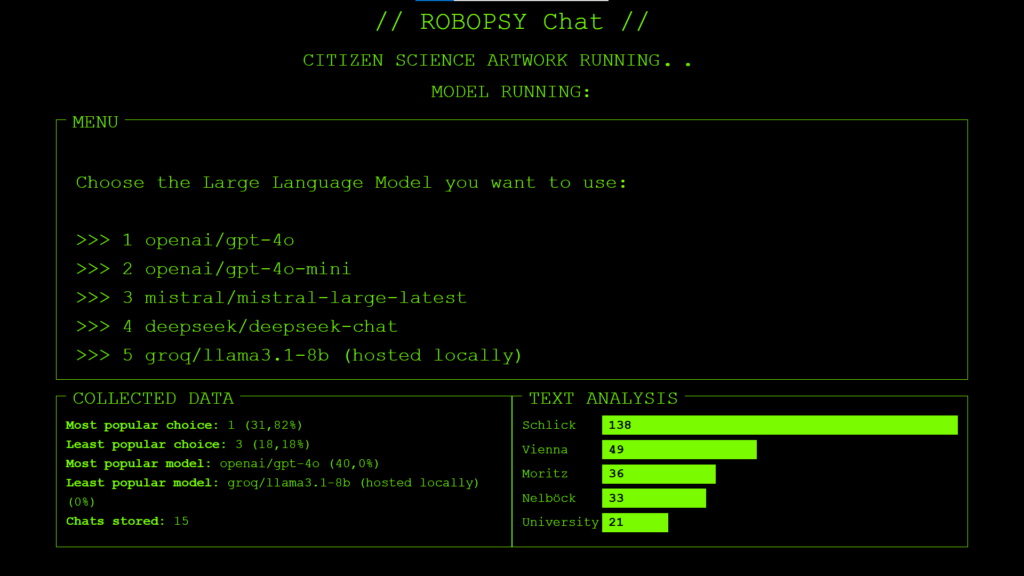 The Robopsy Web Application (prototpye) is used to examine the output of different large language models such as gpt4o, llama or deepseek. It is part of the artistic research project Robopsychologists: An Artistic Exploration of Collective
